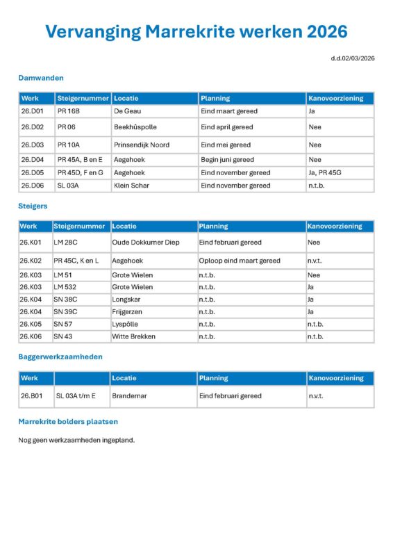 Het moment van uitvoering is afhankelijk van de planning van de aannemer, het weer en andere (onvoorziene) omstandigheden. Tijdens de werkzaamheden is het vaak niet mogelijk om van de betreffende ligplaats(en) gebruik te maken.